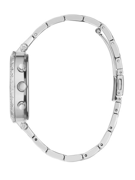 Un Ceas De Lucru Elegant și Elegant Pentru Weekend. Acest Ceas Multifuncțional în Nuanțe De Argintiu Are Un Cadran Mat Cu Design Quattro G, Ornamente Cu Strasuri și O Lunetă Cu Cristale.