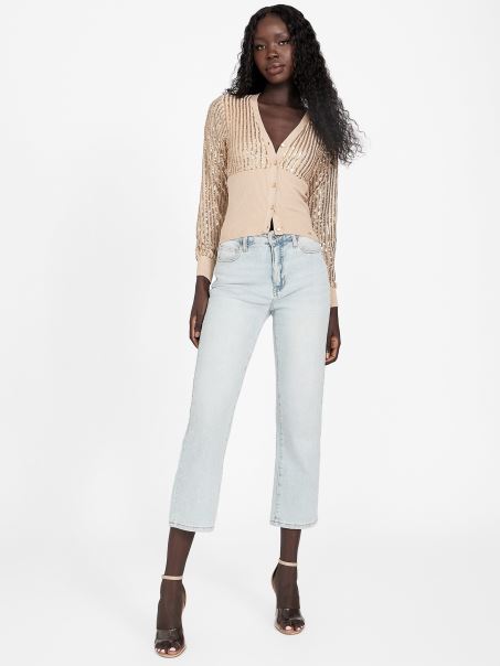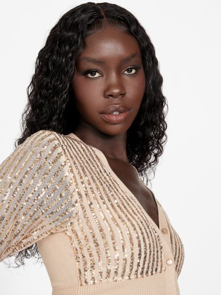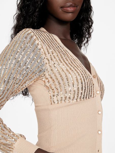 Pregătește-te Pentru Strălucirea Ta în Acest Pulover Cu Paiete, Conceput Cu O Plasă Cu Paiete, închideri Frontale Cu Nasturi, Bordură și Talie Cu Nervuri.