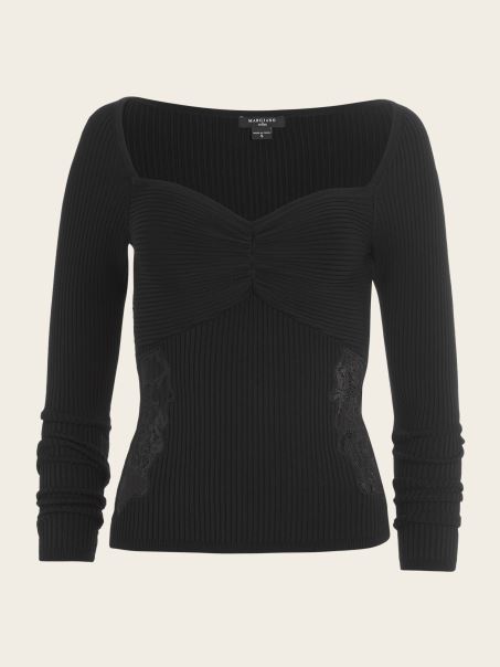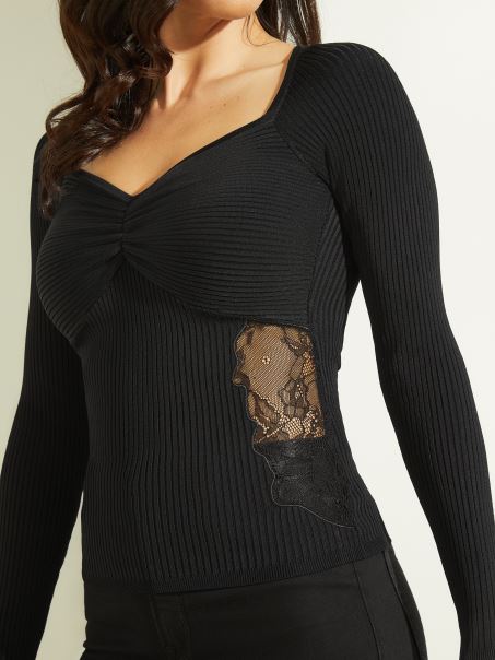 Inserțiile Din Dantelă Transparentă în Lateral Adaugă Un Element Atrăgător Acestui Top Din Tricot Pulover. Proiectat într-o țesătură Cu Nervuri, Cu Un Decolteu în Formă De Inimă Cu Volan și Mâneci Lungi Raglan.