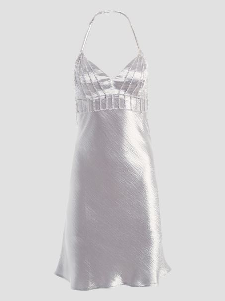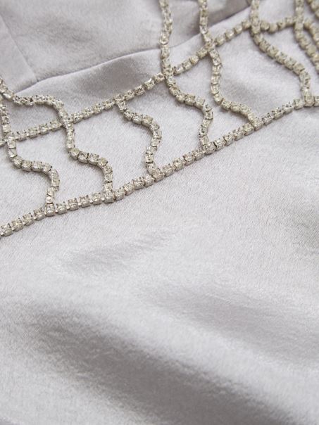 îmbrățișează Acele Momente Magice în Această Rochie Din Satin Metalic, Cu Un Decolteu în V și Un Corset Cu Bretele, Cu Detalii Din Strass și închidere Tip Homar. Contine Plastic Reciclat.
