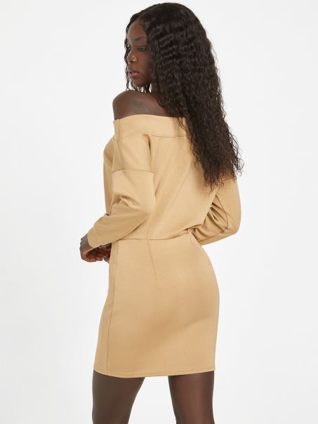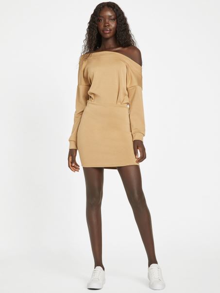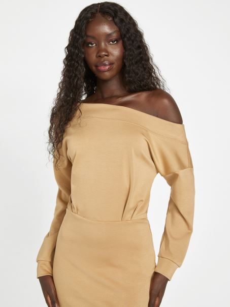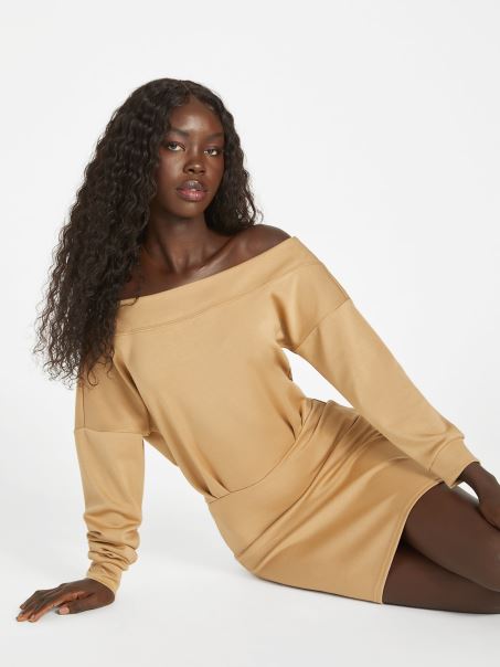 Un Clasic Instantaneu Al Dulapului, This Rochie Este Concepută într-un Tricot Moale și Are Un Decolteu Fără Umeri, Mâneci Lungi și Fustă Moale.
