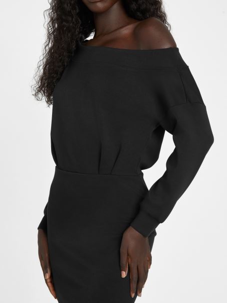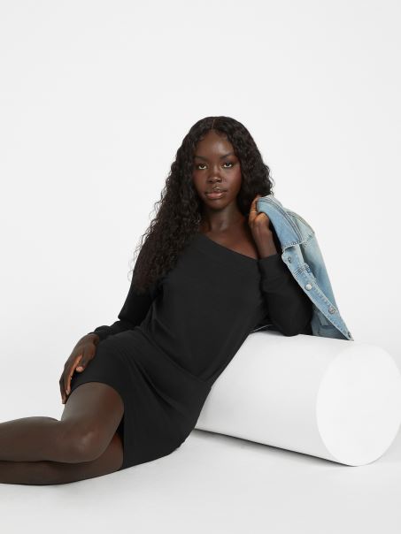 Un Clasic Instantaneu Al Dulapului, This Rochie Este Concepută într-un Tricot Moale și Are Un Decolteu Fără Umeri, Mâneci Lungi și Fustă Moale.