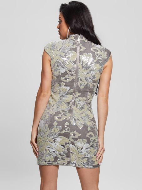Veți Uimi în Această Rochie Mini Plină De Farmec, Cu Paiete Peste Tot într-un Model Floral, Un Decolteu Fals, Mâneci Tip șapcă și Fermoar Ascuns La Spate.