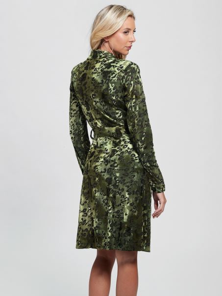 Fă Planuri în Această Rochie Cu Mânecă Lungă, Cu O Compoziție Luxoasă De Catifea Periată, Cu Imprimeu Contrastant De Leopard. Proiectat Cu Guler Pliat, Buzunare Plasate Duble, închidere Cu Nasturi Frontale și Curea în Talie.