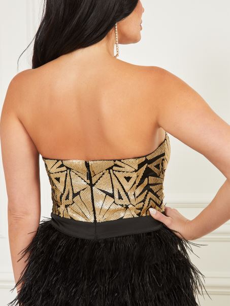 Ieși în Evidență în Această Rochie Mini Cochetă, Concepută Cu Un Corset Fără Bretele Cu Detaliu Din Paiete, O Talie Mătăsoasă și O Fustă Din Pene. Inchidere Cu Fermoar La Spate.