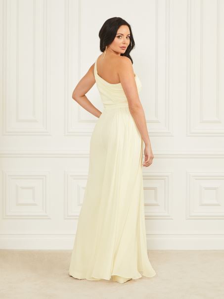 The spotlight is yours, so reach for this beautiful crepe jumpsuit featuring an asymmetrical neckline, a one-shoulder strap, wide leg and a gathered charmeuse top-layer that flows out into a side train. Hidden side zipper.