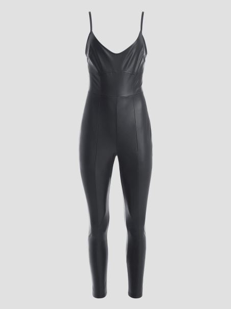 înfășurați-vă Cu Margini în Această Salopetă Structurată Din Piele Artificială. Cu O Potrivire Măgulitoare Care îmbrățișează Curbe, Bretele Reglabile, Picior Subțire și Fermoar La Spate.