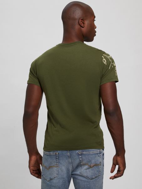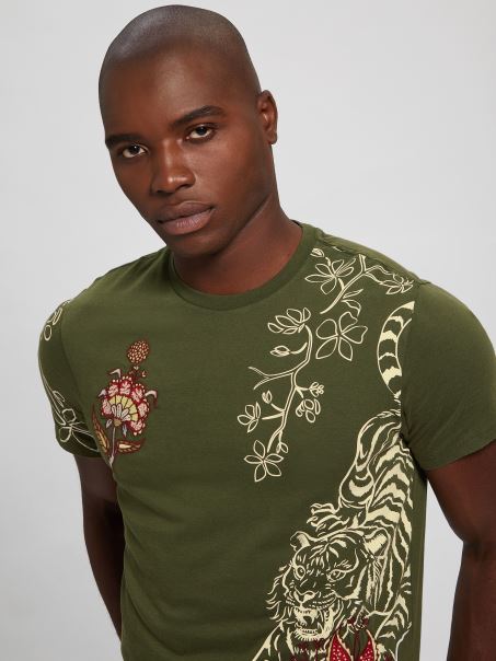 Tricou Brodat Floral Multi Tigru Verde Peyote Guess