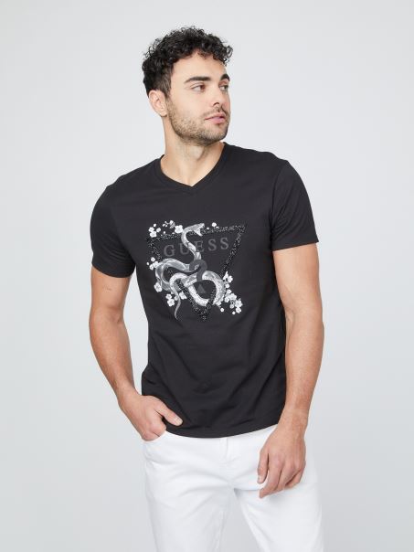 Tricou Cu Decolteu în V, Cu O Pictogramă Cu Logo în Față, Cu șarpe și Flori. Finisat Cu Detaliu Din Strass.