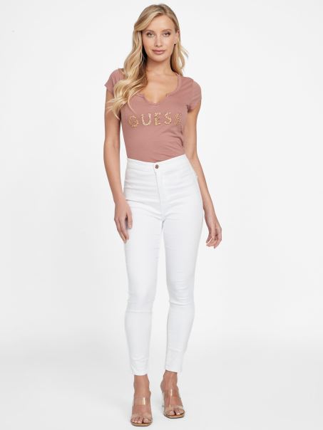Le Pune O Sclipire în Ochi. Acest Tricou Din Tricou Are Un Decolteu Crestat, Logo Cu Sclipici și Mâneci.
