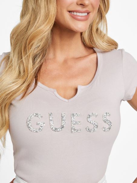 Le Pune O Sclipire în Ochi. Acest Tricou Din Tricou Are Un Decolteu Crestat, Logo Cu Sclipici și Mâneci.