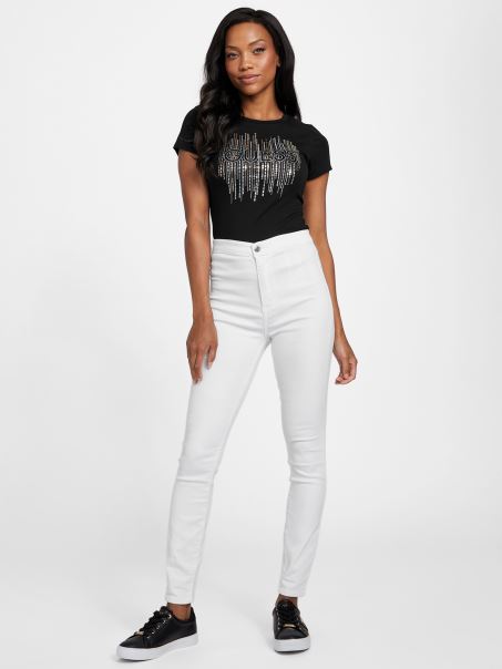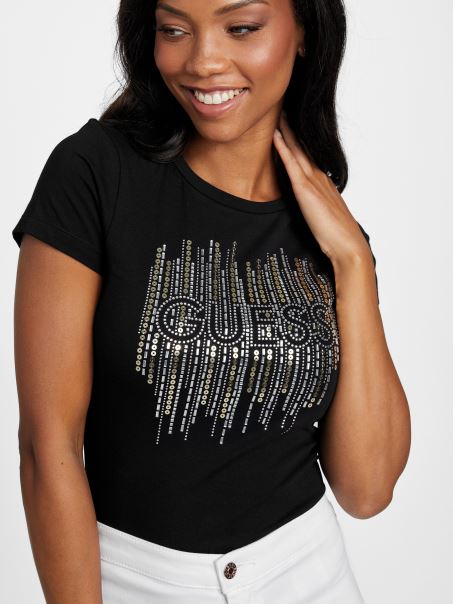 Străluciți în Toată Strălucirea Dvs. Cu Acest Tricou Din Jerseu Cu Un Logo în Față Cu Paiete și Strasuri, Un Decolteu Cu Mâneci Scurte.