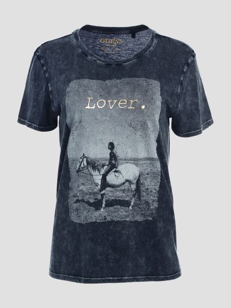 Conceput într-o Fabricație Fără Efort, Acest Tricou Cu Mânecă Scurtă Prezintă Un Gât Roșu și O Fotografie De Călăreț Cu Text Suprapus.