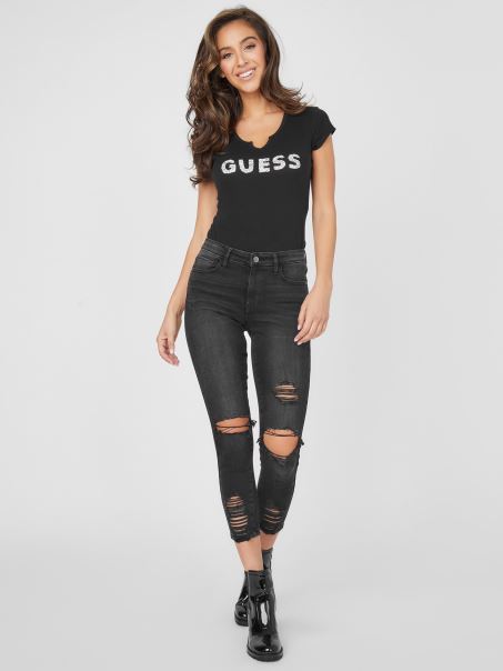 Le Pune O Sclipire în Ochi. Acest Tricou Din Tricou Are Un Decolteu Crestat, Logo Cu Sclipici și Mâneci.