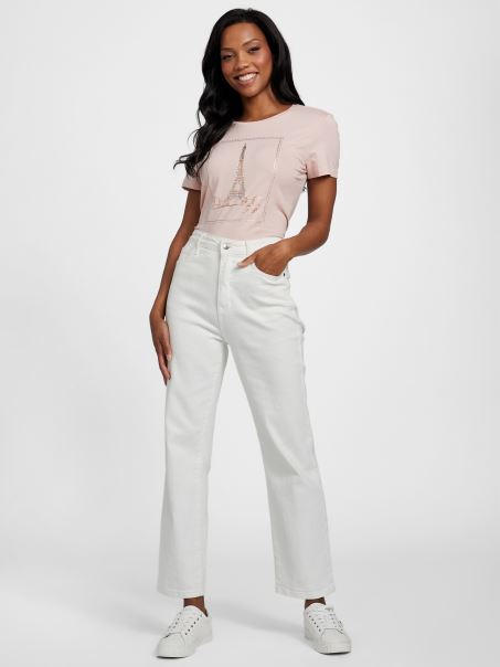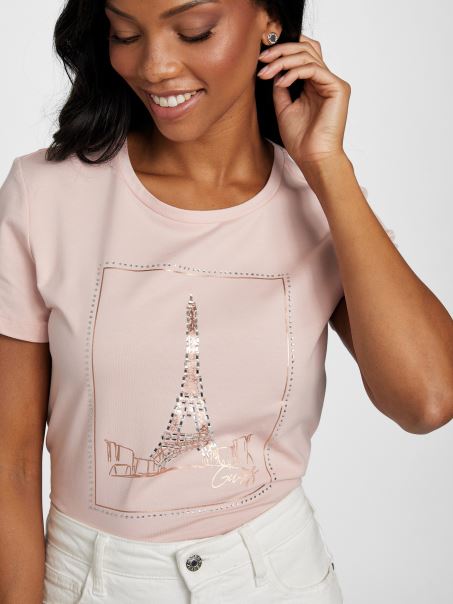 Paris Este Pentru îndrăgostiți, La Fel și Acest Tricou Din Tricou, Cu Un Grafic Turn Din Folie Cu Logo și Ornamente Cu Strasuri, Precum și Un Decolteu Cu Mâneci Scurte.