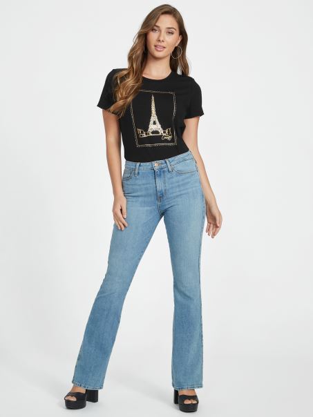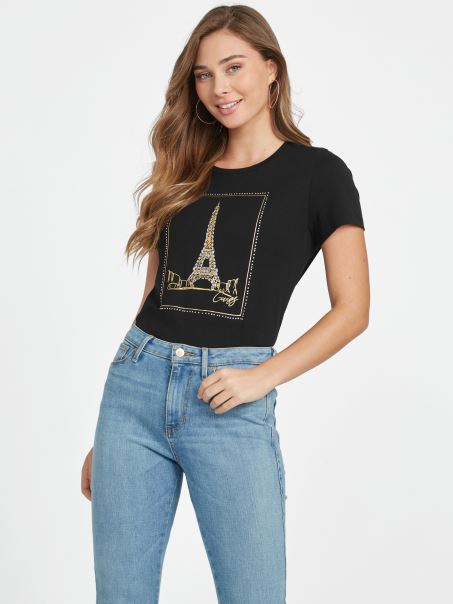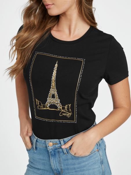 Paris Este Pentru îndrăgostiți, La Fel și Acest Tricou Din Tricou, Cu Un Grafic Turn Din Folie Cu Logo și Ornamente Cu Strasuri, Precum și Un Decolteu Cu Mâneci Scurte.
