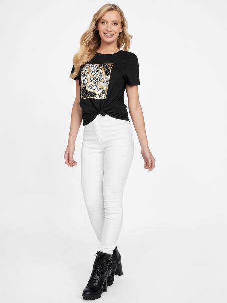 Un Nou Tricou Grafic La Care Să Ajungeți, Acest Stil Cu Mânecă Scurtă Are Un Gât Roșu și Un Panou Mixt Cu Imprimeu Animal în Față, Cu Text Cu Logo Metalic Suprapus.