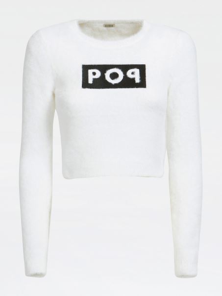 Home| Femei| îmbrăcăminte| Vârfuri| Alb Cu Gât Rotund Crop Fit Pulover Guess