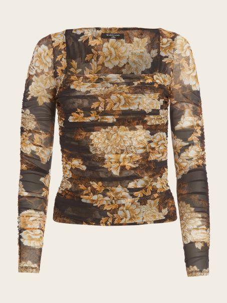 Găsiți Libertatea Zi și Noapte Cu Acest Top Din Plasă. Cu O Plasă încâlcită, Imprimeu Mixt Floral și Geometric, Decolteu în Formă De Inimă și Mâneci Lungi.