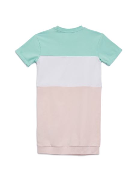 O Interpretare Uluitoare A Unei Piese De Zi Cu Zi Pentru Ea. Rochie Din țesătură Franțuzească, Cu Un Design Color-block, Strasuri și Logo Brodat, Decolteu în Picioare și Mâneci Scurte Cu Manșete Rulate.