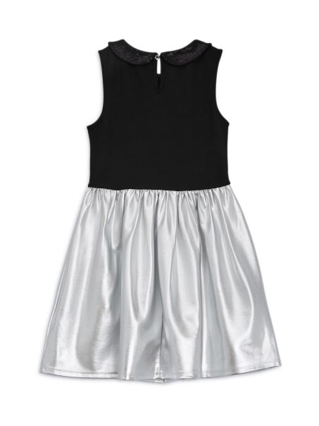 Va Fi O Vedetă Strălucitoare în Această Rochie Adorabilă, Cu O Fustă Metalizată, Croială Fără Mâneci și Decolteu înalt, Cu Un Guler Peter Pan Cu Paiete. închidere Cu Nasturi La Spate.