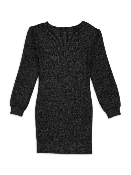Ea Va Străluci Strălucitor în Această Rochie Din Amestec De Lână, Dintr-o țesătură Din Tricot De Pulover Cu Nervuri, Cu O Strălucire Integrală Inspirată De Lurex, Decolteu înalt, Mâneci Lungi Cu Balon, Logo Cu Strasuri și Lungime Midi.