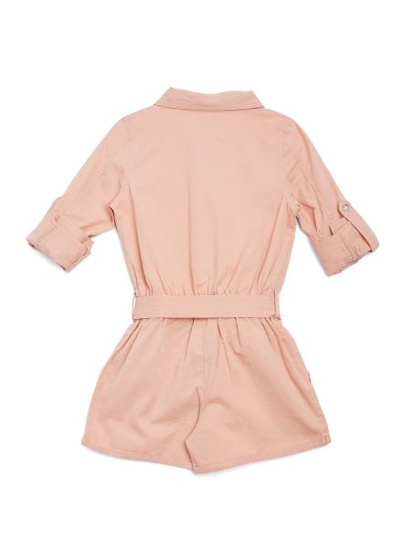 Acest Salopet Dragut Din Denim Are Guler Pliat, Fermoar, Centură De Cravată în Talie, Mâneci Rulante, Manșete Rulate și Buzunare Frontale. Detalii De Nasturi Inspirate Din Cristale.