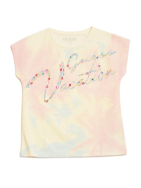 Fetele Vor Doar Să Se Distreze în Vacanță. Acest Tricou Din Jerseu, Cu Un Logo și Un Text împodobite Cu Pietre Prețioase, Imprimeu Subtil Cu Frunze, Mâneci Dolman Scurte și Decolteu Echipaj, îl Vor Oferi O Mulțime.