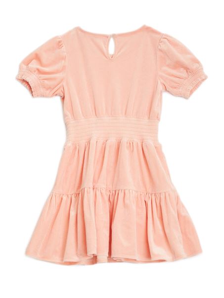 Jucăușă și Dulce, O Rochie De Catifea Cu Detalii Cu Fumuri, O Fustă Cu Etaje, Mâneci Scurte și Un Decolteu Rotund Cu Nasturi La Spate.